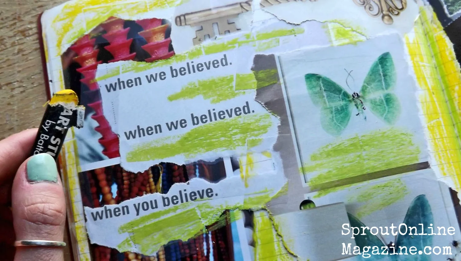 And art journaling, in particular? Art journaling is prayer for me: a safe, sacred space where I can clear the static in my mind and tune into Spirit instead. I work quickly, intuitively, often tearing magazine fragments of word and image and piecing them together in ways that somehow make me feel whole.