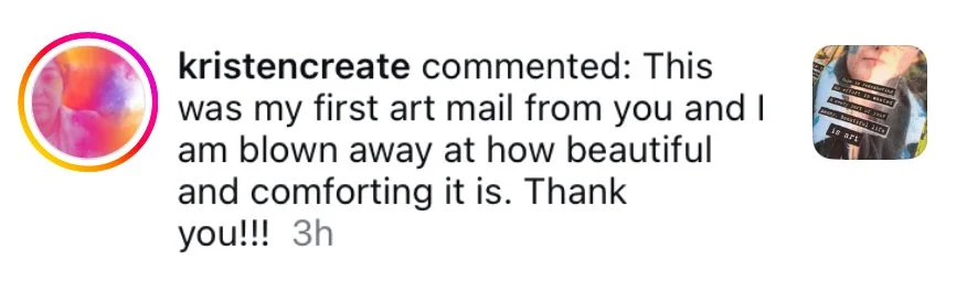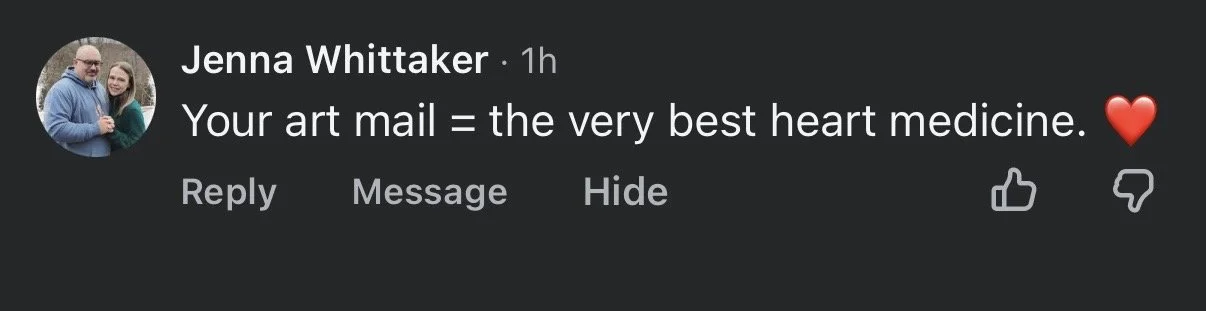 “Your art mail has changed my life, has changed the way I see life and how to adjust the lens to see the glimmers and words of hope, love, wisdom and spirit. Your art mail has enhanced my spiritual practice and my writing. Thank you for your hard work and the never fail gifts monthly.”